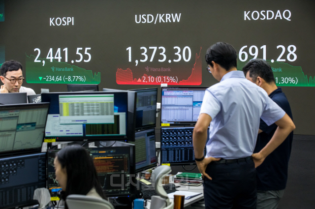 코스피와 코스닥지수가 장중 동시에 8% 넘게 폭락하며 두 시장의 거래를 일시 중단시키는 '서킷브레이커'가 약 4년 5개월 만에 발동된 5일 서울 중구 하나은행 딜링룸에서 직원들이 분주히 업무를 보고 있다. 이날 코스피는 전 거래일보다 234.64포인트 하락한 2441.55, 코스닥은 88.05포인트 하락한 691.28로 장을 마감했다.
