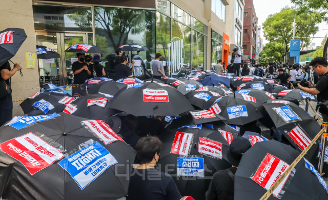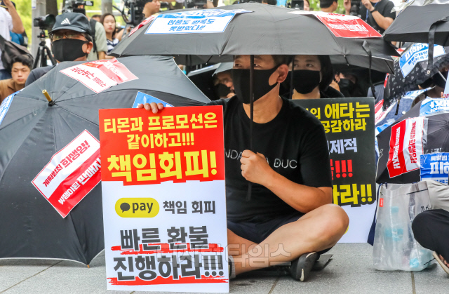 티몬·위메프 사태 피해자들이 13일 서울 강남구 티몬 사옥 앞에서 조속한 정산 및 환불 조치, 구영배 큐텐 회장 등 관련자 수사를 촉구하는 검은 우산 집회를 하고 있다.