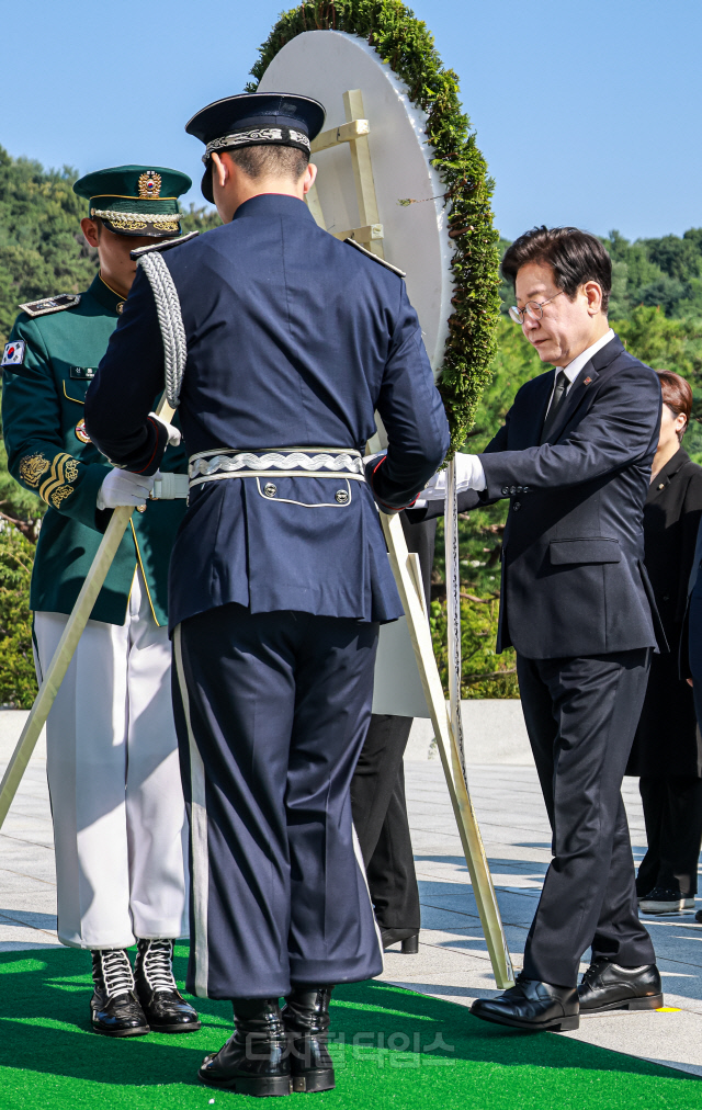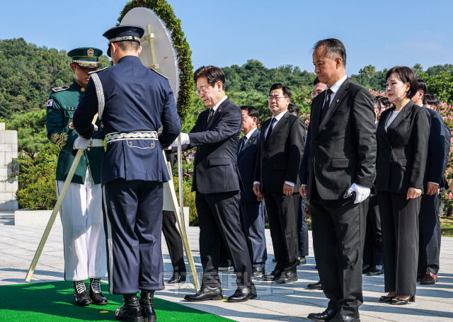 이재명 더불어민주당 대표와 신임 지도부가 19일 동작구 국립서울현충원을 찾아 참배를 하고 있다.
