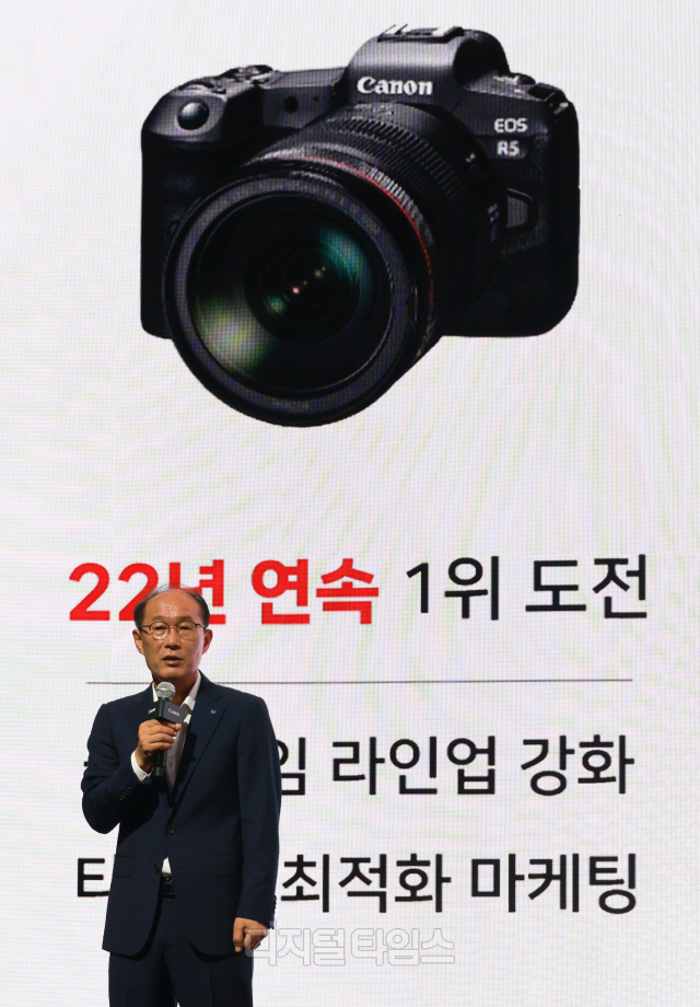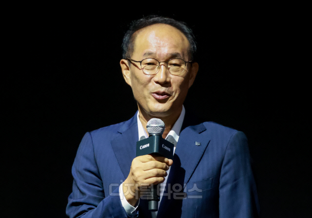 박정우 캐논코리아 대표이사가 23일 서울 송파구 롯데월드타워 시그니엘에서 열린 캐논코리아 EOS R1 및 EOS R5 Mark II 정식 발표 기자간담회에서 환영사를 하고 있다.