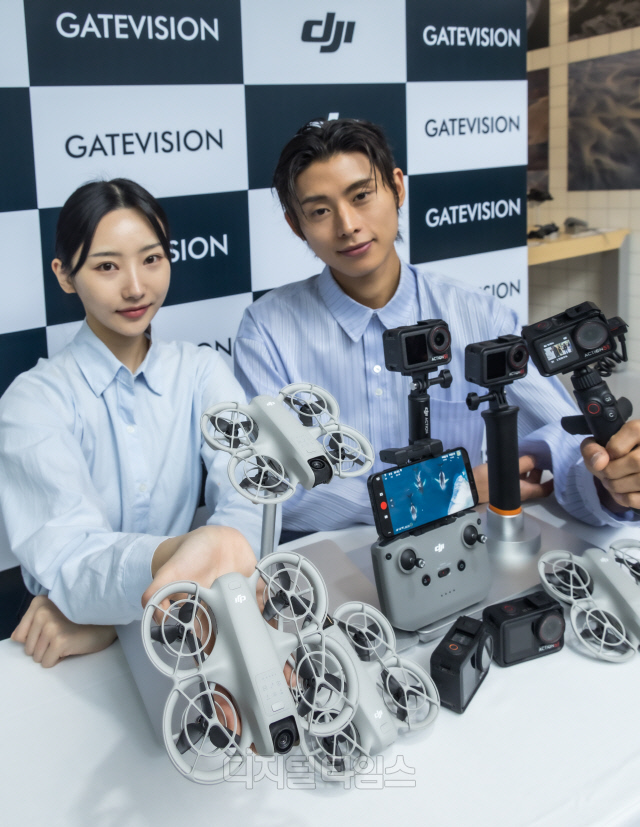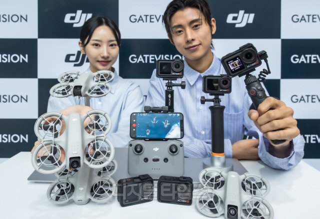 25일 DJI 공식수입원인 게이트비젼이 서울 신사동 DJI부띠끄 강남에서 진행한 DJI 신제품 출시 행사에서 모델들이 드론 신제품 'DJI Neo'와 액션캠 신제품 '오즈모 액션5 프로'를 소개하고 있다.