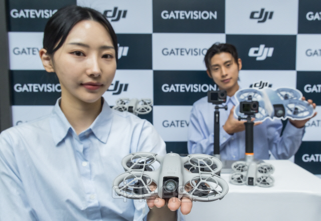 25일 DJI 공식수입원인 게이트비젼이 서울 신사동 DJI부띠끄 강남에서 진행한 DJI 신제품 출시 행사에서 모델들이 드론 신제품 'DJI Neo'와 액션캠 신제품 '오즈모 액션5 프로'를 소개하고 있다.
