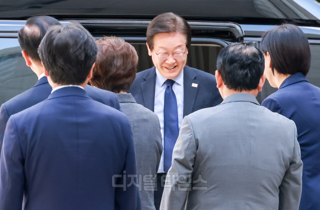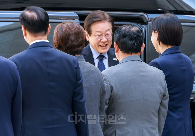 [포토] 재판 전 밝은 표정으로 의원들과 인사하는 이재명 대표