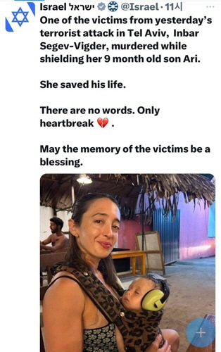지난 1일(현지시간) 이스라엘 텔아비브 야파지구의 경전철역에서 발생한 총격 테러 당시 한 여성이 9개월 아들을 온몸으로 보호해 살리고 희생된 것으로 알려졌다.