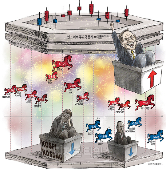 반면 미국증시 3대 지수 중에서는 다우존스 산업평균지수(12.30%)와 스탠더드앤드푸어스(S&P)500지수(21.26%)는 물론 코스닥과 마찬가지로 기술주 중심인 나스닥지수(22.84%)까지 모두 두 자릿수 수익률을 보였다.