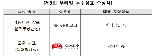 특허청, '우리말 우수상표' 7건 뽑아 '솜씨가', '눈결소금', '맛있개도냥냥' 등 특허청이 제578돌 한글날을 맞아 우리말 상표 출원과 사용을 장려하기 위해 '제9회 우리말 우수상표'를 선정했다고 7일 밝혔다.