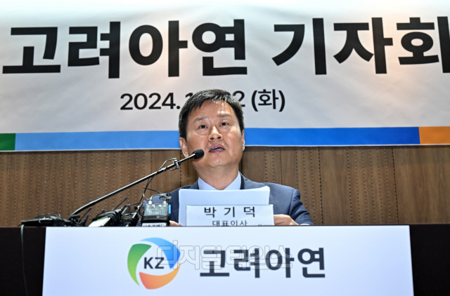 박기덕 고려아연 대표이사가 22일 서울 중구 세종대로 코리아나호텔에서 영풍-MBK파트너스 연합과의 경영권 분쟁 관련 긴급 기자회견을 하고 있다.