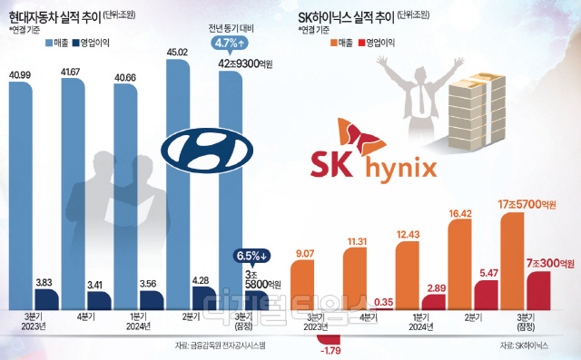 SK하이닉스 AI 생태계 대응 성공 3분기 영업익 7조… 이익률 40% 현대차 하이브리드 강화 적중해 매출 42.9조·영업익 3.5조 기록 SK하이닉스의 사상 최대 실적을 내면서 인공지능(AI) 시대로의 변화를 예견한 최태원 SK그룹 회장의 전략이 적중했다는 평을 받는다. 현대자동차 역시 정의선 현대차그룹 회장의 미래 전략과 고부가 라인업 확대 전략으로 글로벌 자동차 시장의 침체 속에서도 매출 성장을 이끌어 냈다. 양사는 이러한 미래 전략 적중으로 AI·소프트웨어 중심으로 전환되는 산업 생태계에서 글로벌 리딩 기업으로 우뚝 올라섰다.