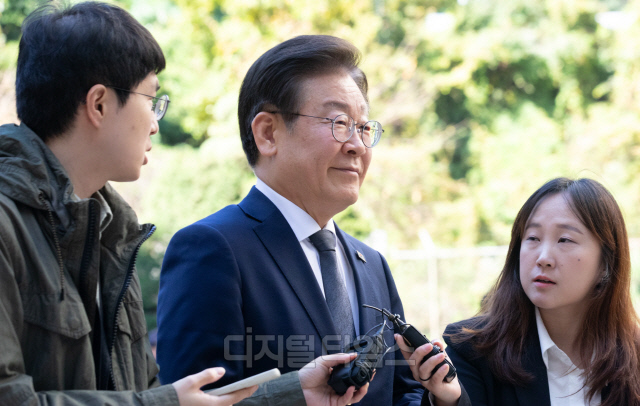 이재명 더불어민주당 대표가 25일 서울 서초구 서울중앙지법에서 열린 '대장동 배임·성남FC 뇌물' 1심 속행 공판에 출석하고 있다.