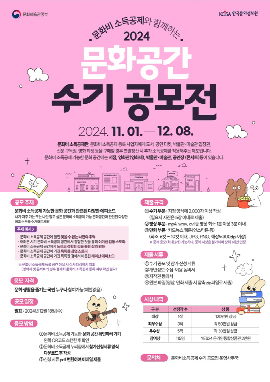 공모전의 주제는 문화비 소득공제와 관련한 재미있는 에피소드나 추억담, 독특한 창업스토리 등이며, 수기나 만화, 영상 등의 형태로 제작해 응모하면 된다. 참가 접수는 12월 8일까지. 참가 작품은 전문가 심사를 거쳐 총 9편을 선정해 12월 18일 발표할 예정이다.