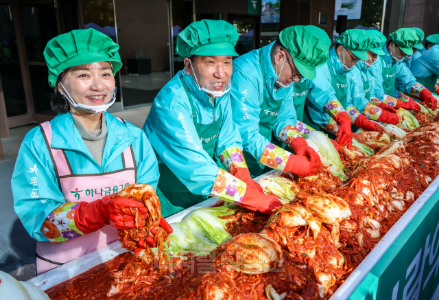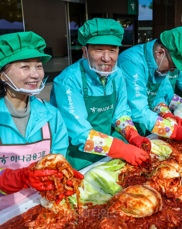 함영주(왼쪽 두번째) 하나금융그룹 회장을 비롯한 임직원들이 11일 서울 중구 하나금융그룹 명동사옥에서 열린 '2024 모두하나데이' 행사에서 김장 봉사를 하고 있다. '모두하나데이'는 올해 14번째를 맞이하는 하나금융그룹의 대표적인 ESG 활동으로, 함영주 회장과 엄종환 SK텔레콤 부사장, 황성욱·김대원 롯데웰푸드 상무 등 약 300여명이 이날 담근 1만 1111포기 김장 김치는 소외 계층에 전달된다.