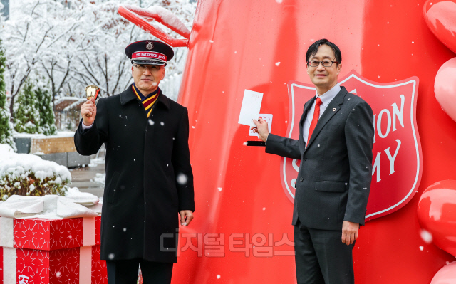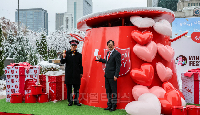 이경우 휘슬러코리아 대표(오른쪽)가 27일 서울 중구 서울광장에서 열린 '2024 휘슬러X구세군 사랑샘 자선냄비 체험관' 전달식에서 성금을 넣고 있다. 휘슬러코리아는 지난 2004년부터 자선냄비 전달식을 통해 21년 간 구세군에게 자선냄비를 후원하고 있다.