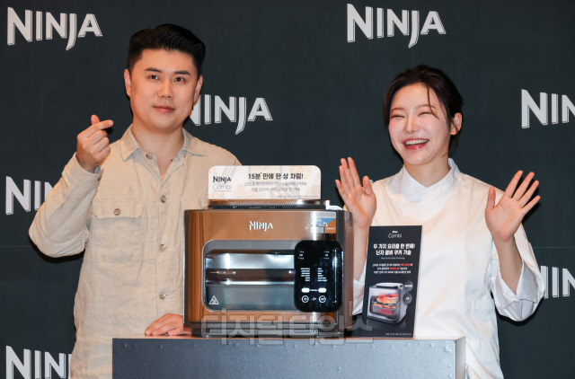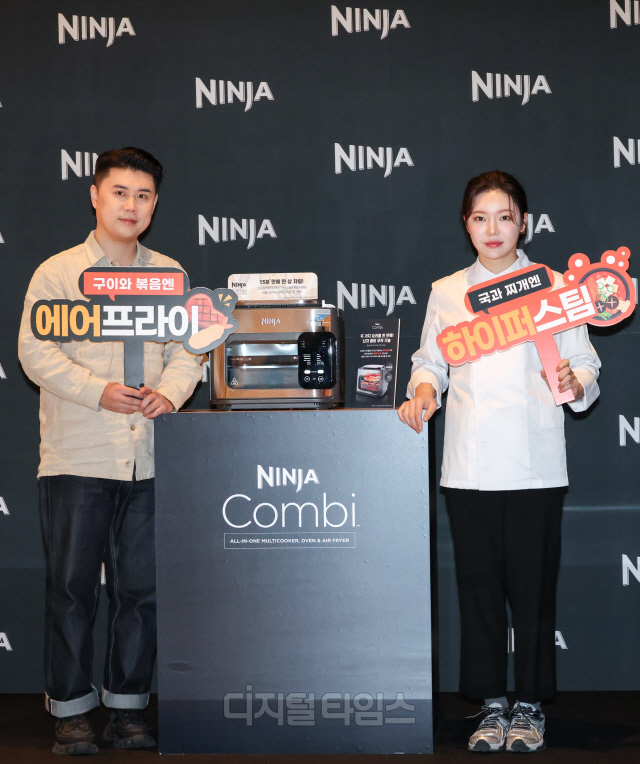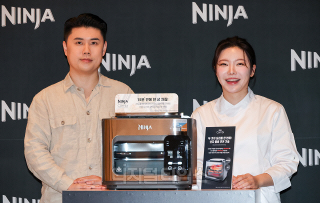 흑백요리사 우승자인 '나폴리 맛피아' 권성준 셰프와 '장사천재 조사장' 조서형 세프가 28일 서울 용산구 그랜드 하얏트 호텔에서 열린 닌자(Ninja)의 '콤비 올인원 멀티 쿠커' 출시행사에서 신제품을 소개하고 있다.