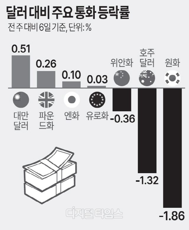 8일 서울외환시장에 따르면 원·달러 환율은 지난 한 주간 24.5원(주간거래 종가 기준) 뛰었다. 지난주 상승 폭은 지난 1월 15~19일 25.5원 이후 약 11개월 만에 가장 컸다. 환율은 지난달 29일 1394.7원에서 지난 6일 1419.2원으로 오르며 1400원대가 고착화하는 모습이다.