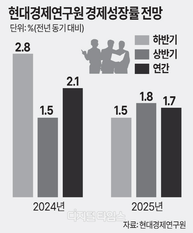현대경제연구원은 8일 '한국경제 수정전망' 보고서에서 내년 경제 성장률 예상치를 1.7%로 제시했다. 지난 9월 당시 2.2%보다 0.5%포인트(p)나 낮아졌다.