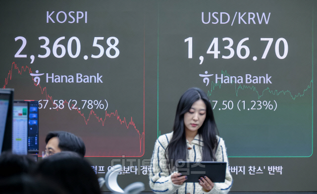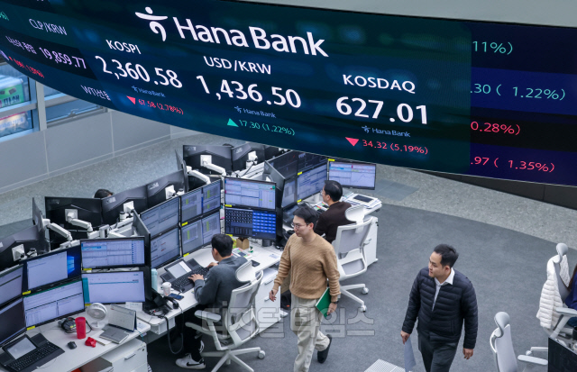 코스피와 코스닥이 급락한 9일 서울 중구 하나은행 딜링룸에서 직원들이 분주히 업무를 보고 있다. 이날 코스피는 67.58포인트 하락한 2360.58, 코스닥은 34.32포인트 하락한 627.01로 장을 마감했다.