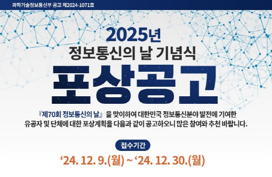 후보자 접수는 12월 9일부터 오는 12월 30일까지 진행되며, 한국정보방송통신대연합(ICT대연합)이 접수를 담당한다. 자세한 내용은 과학기술정보통신부 또는 ICT대연합 홈페이지를 통해 확인할 수 있다. 접수된 후보자는 공개 검증과 공적 심사를 거쳐 최종 수상자가 선정된다. 수상자 발표와 시상은 2025년 4월 예정된 제70회 정보통신의 날 기념행사에서 진행된다.