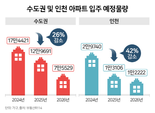 전국에는 26만7489가구의 아파트가 입주할 예정으로 올해 36만3921가구보다 27%나 감소한다. 이 중에서도 인천은 동기간 2만2638가구에서 1만3106가구로 42%나 줄어들 예정이라 신축 아파트가 더욱 귀해질 것으로 보인다.