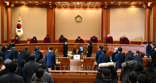 내란 우두머리 혐의로 구속기소된 윤석열 대통령의 탄핵 심판 5차 변론이 열린 4일 서울 종로구 헌법재판소 대심판정에서 문형배 헌법재판소장 직무대행을 비롯한 헌법재판관이 입장하고 있다. 사진공동취재단
