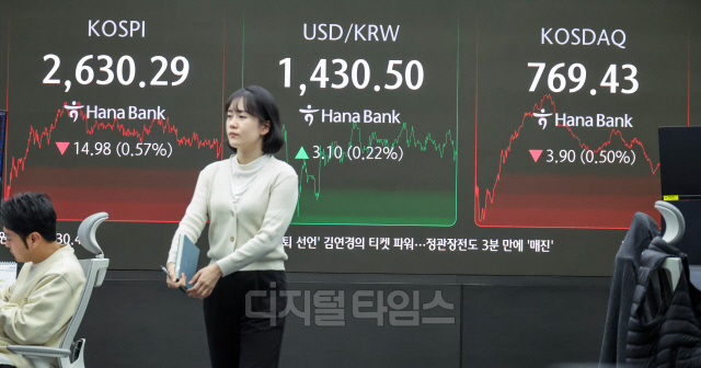 코스피가 전 거래일보다 14.98포인트 내린 2,630.29로 마감한 25일 서울 중구 하나은행 본점 딜링룸에서 직원들이 업무를 보고 있다. 코스닥은 3.90포인트 내린 769.43으로 마감했다.