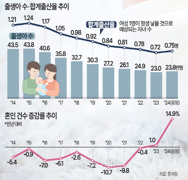 합계출산율(여성이 평생 낳을 것으로 예상되는 평균 출생아 수)은 0.75명으로 전년(0.72명)보다 0.03명 증가했다. 2015년(1.24명) 이후 9년 만에 첫 반등이다.