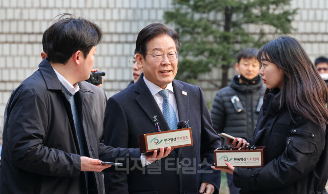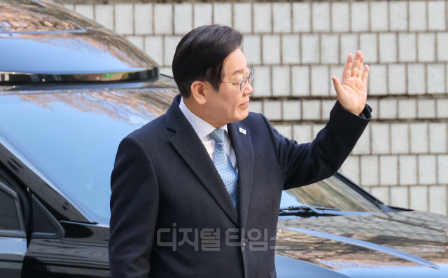 이재명 더불어민주당 대표가 26일 서울 서초구 서울고등법원에서 열린 공직선거법 위반 혐의 항소심 5차 공판에 출석하며 지지자들을 향해 손인사를 하고 있다.