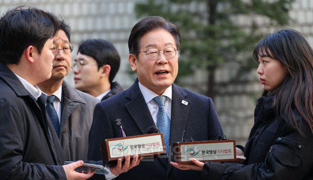 이재명 더불어민주당 대표가 26일 서울 서초구 서울고등법원에서 열린 공직선거법 위반 혐의 항소심 5차 공판에 출석하며 취재진 질문에 답하고 있다.
