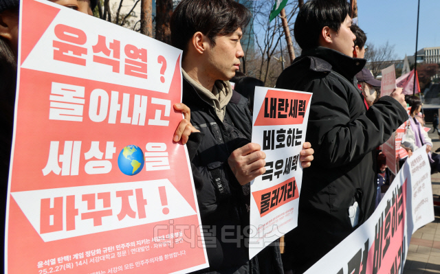 27일 서울 마포구 서강대학교 정문에서 '윤석열 탄핵! 계엄 정당화 규탄! 민주주의 지키는 서강대 대응행동' 주최 탄핵 찬성 집회가 열리고 있다.