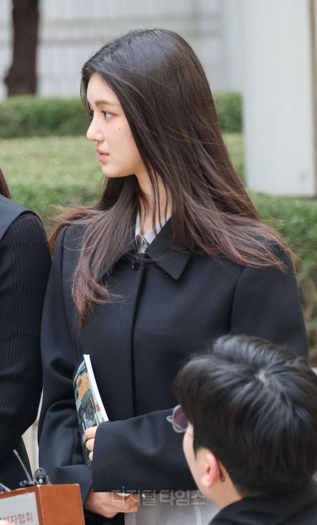 그룹 뉴진스(NJZ)의 다니엘이 7일 서울 서초구 서울중앙지방법원에서 열린 '기획사 지위보전 및 광고계약 체결 등 금지' 가처분 신청의 심문기일을 마친 뒤 법원 청사를 나서며 취재진 질문을 듣고 있다.
