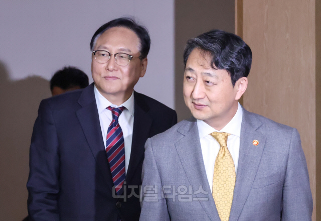 안덕근 산업통상자원부 장관(오른쪽)과 정인교 산업통상자원부 통상교섭본부장이 12일 서울 중구 대한상의에서 열린 민관 합동 미 관세조치 대응전략 회의에 참석하고 있다.