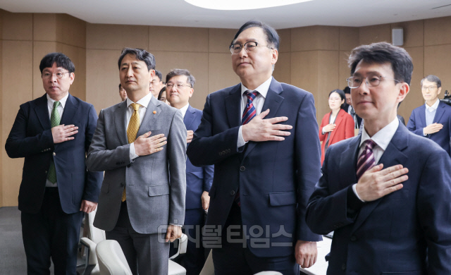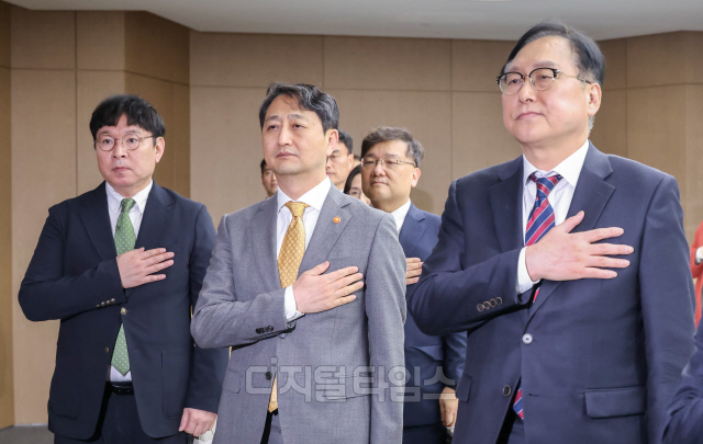 [포토] 국민의례 하는 안덕근 장관-정인교 통상교섭본부장