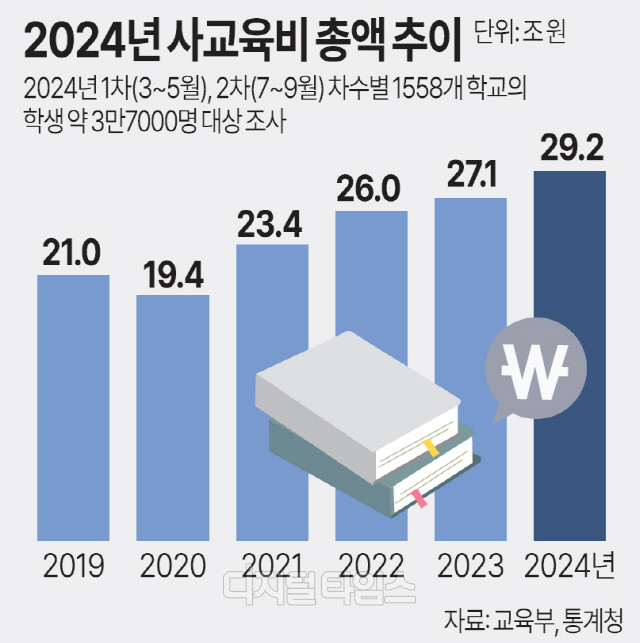 통계청이 13일 발표한 '2024년 초중고 사교육비 조사결과'를 보면 지난해 초중고 사교육비 총액은 29조2000억원으로 1년 전보다 7.7%(2조1000억원) 늘었다. 초중고 사교육비는 2021년(23조4000억원) 이후 4년 연속 증가세를 보인다.