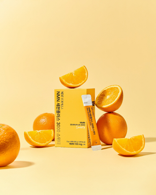 '넥스트포뮬러'는 NMN을 핵심 원료로 하는 NMN 전문 브랜드로, 그 첫 번째 제품으로 'NMN 세븐플러스 3000 스위티'를 출시했다. 이번 신제품은 1포당 NMN 100mg을 함유하고 있으며, 한 박스(30포) 기준 총 NMN 함량은 3,000mg에 달한다. 또한, NMN의 작용을 돕는 7가지 부원료, △프테로스틸벤 △퀘르세틴 △진세노사이드 △글루타치온 △니코틴산아미드 △인디안구스베리 △모링가잎을 함유해 NMN과의 시너지 효과를 극대화했다.