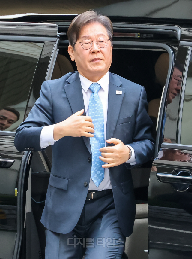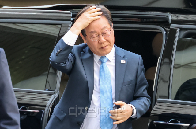 21대 대통령 선거 출마를 선언한 이재명 더불어민주당 전 대표가 15일 서울중앙지방법원에서 열린 '대장동 배임·성남FC 뇌물' 1심 속행 공판에 출석하고 있다.