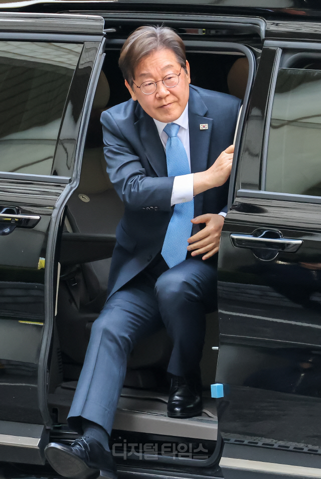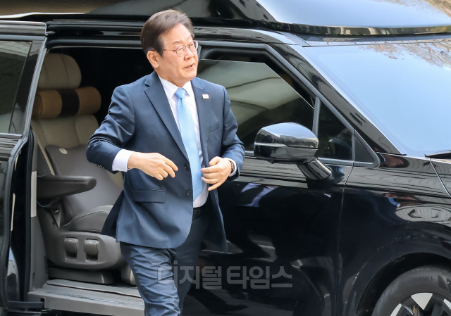 21대 대통령 선거 출마를 선언한 이재명 더불어민주당 전 대표가 15일 서울중앙지방법원에서 열린 '대장동 배임·성남FC 뇌물' 1심 속행 공판에 출석하고 있다.