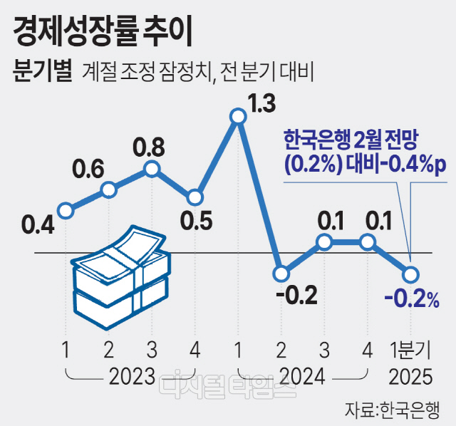 한국경제가 올해 1분기 결국 역성장했다. 3분기 만에 성장 엔진이 다시 멈춰선 것이다. 미국 상호관세 영향이 본격화하기도 전에 벌어진 일이라 충격이 더 크다.