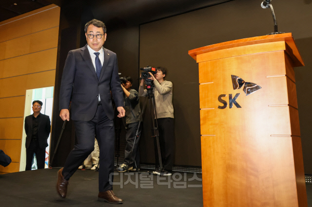 유영상 SK텔레콤 대표이사가 25일 서울 중구 SKT타워 수펙스홀에서 SK텔레콤 이용자 유심(USIM) 정보가 해커 공격으로 유출된 것과 관련해 사과하기 위해 단상으로 향하고 있다.
