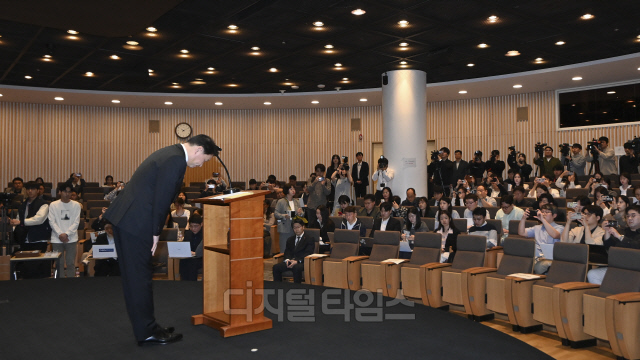 최태원 SK그룹 회장이 7일 서울 중구 SK텔레콤 T타워에서 열린 유심(USIM·가입자 식별 모듈) 해킹 사태에 관한 브리핑에서 대국민 사과를 하고 있다.