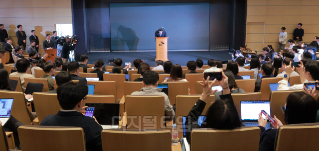 최태원 SK그룹 회장이 7일 서울 중구 SK텔레콤 T타워에서 열린 유심(USIM·가입자 식별 모듈) 해킹 사태에 관한 브리핑에서 대국민 사과를 하고 있다.