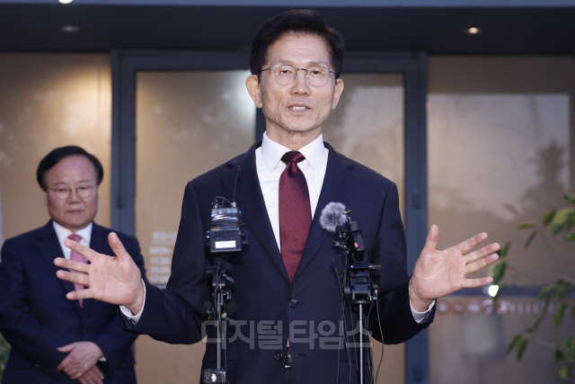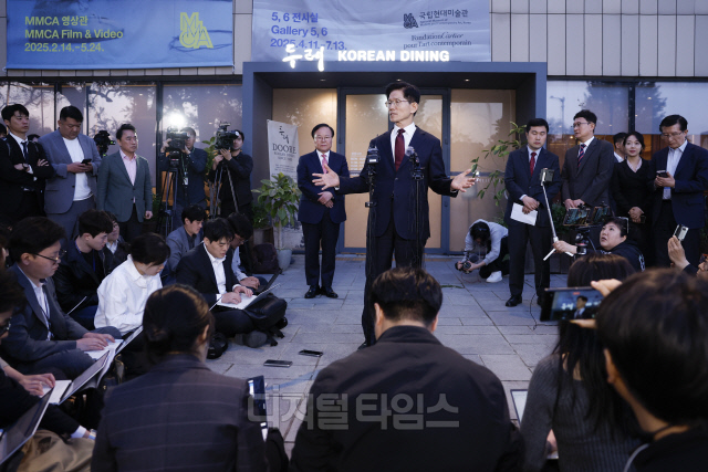 김문수 국민의힘 대선 후보가 7일 서울 종로구의 한 식당에서 한덕수 무소속 대선 예비후보와 단일화 관련 회동을 마친 후 취재진의 질문에 답하고 있다. 이날 회동은 합의된 사안 없이 종료됐다.