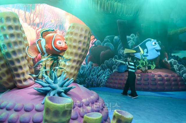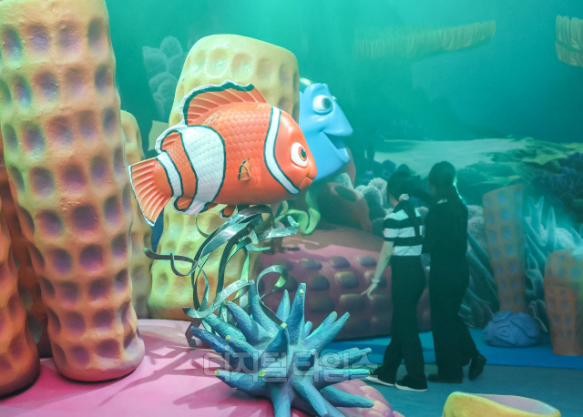 7일 서울 성동구 성수문화예술마당에서 열린 '문도 픽사: 픽사, 상상의 세계로' 전시 언론 공개 행사에서 관계자들이 체험공간을 소개하고 있다.