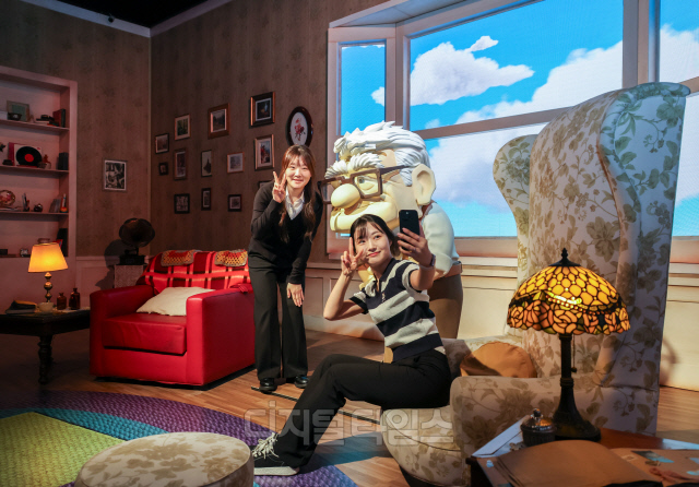 7일 서울 성동구 성수문화예술마당에서 열린 '문도 픽사: 픽사, 상상의 세계로' 전시 언론 공개 행사에서 관계자들이 전시물과 함께 기념촬영을 하고 있다.
