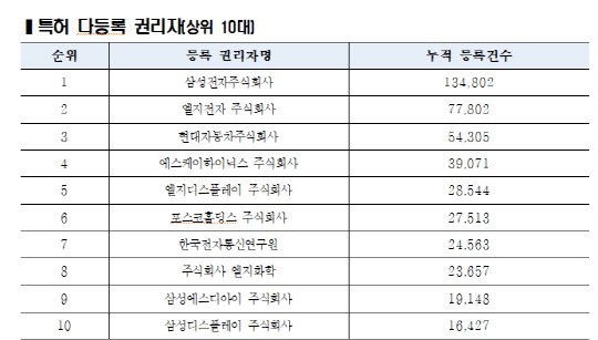특허 등록 1위는 전체 특허의 5%(13만4802건)를 보유한 삼성전자가 차지했다. 1969년 전자사업에 뛰어든 이후 삼성전자는 반도체, 모바일 기기 분야 등 첨단기술 분야에서 전 세계를 대표하는 혁신기업으로 인정받고 있다. 지난 한 해 특허등록 건수는 5255건였다.