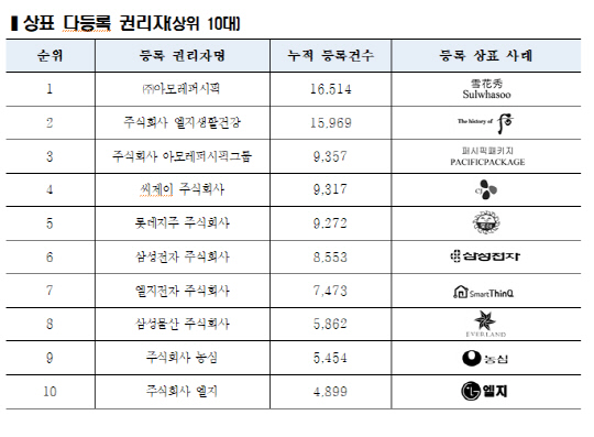 상표 다등록 권리자 1위는 1945년 태평양화학공업사로 시작한 아모레퍼시픽으로, 총 1만6514건을 보유했다. 그 뒤를 LG생활건강(1만5906건), 아모레퍼시픽그룹(9357건), CJ(9317건), 롯데지주(9272건) 등의 순이었다.