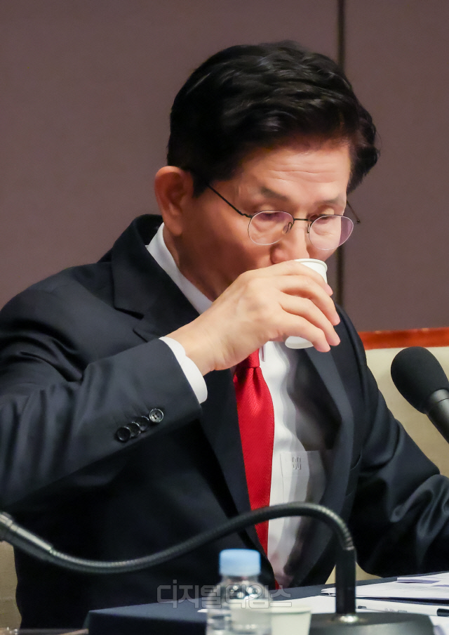 김문수 국민의힘 대선 후보가 8일 서울 중구 한국프레스센터에서 열린 관훈클럽 토론회에서 발언에 앞서 물을 마시고 있다.