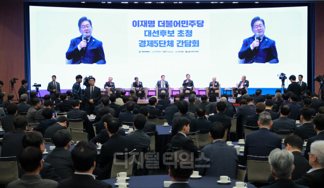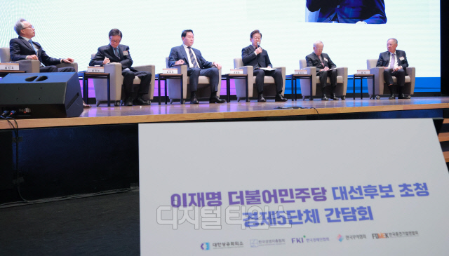 이재명 더불어민주당 대선후보가 8일 서울 중구 대한상공회의소에서 열린 대선후보 초청 경제5단체 간담회에서 발언하고 있다. 왼쪽부터 최진식 한국중견기업연합회장, 윤진식 한국무역협회장, 최태원 대한상공회의소 회장, 이 후보, 손경식 한국경영자총협회장, 류진 한국경제인협회장. 이슬기기자 9904sul@