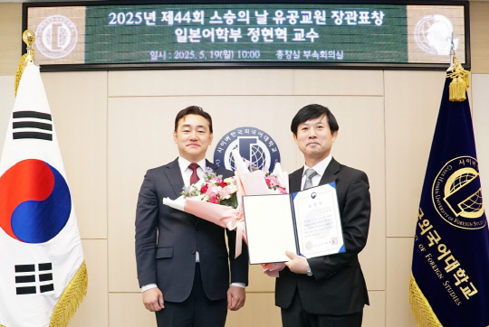 사이버한국외대는 지난 19일 '2025년 제44회 스승의 날 유공교원 장관 표창 수여식'을 개최하고, 장지호 총장이 정현혁 교수에게 직접 표창장을 전달했다. 수여식은 박헌일 교학처장의 사회로 진행됐으며 최서연 기획처장, 강하나 교육혁신처장, 윤호숙 일본어학부장이 함께 배석하여 수상자를 축하했다.