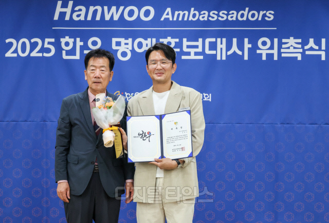 민경천 한우자조금관리위원회 위원장이 28일 서울 종로구 교원챌린지홀에서 열린 '2025년 한우 명예홍보대사 위촉식'에서 방송인 윤형빈에게 명예홍보대사 위촉장을 수여 후 기념촬영을 하고 있다.