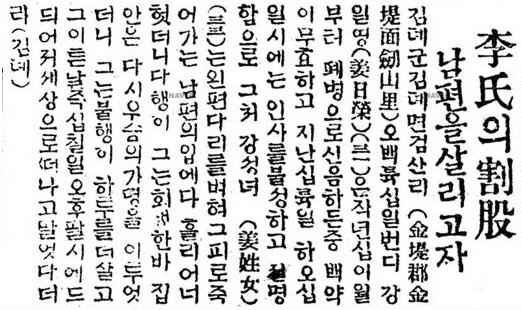 계속해서 '사랑'이라는 이름으로 포장된 잔혹한 모습을 더 들여다 보자. "경남 삼천포 동리 김형수(金馨洙·34)는 신병(身病)으로 신음한 지 수 년이라. 그의 처 강씨(姜氏·33)와 그 아우 김덕수(金德洙·23)는 이후 장구한 세월을 하루같이 간호하던 바 약석(藥石)의 효험이 없이 병세가 점점 위중해져서 지난달 23일에 이르러 그만 절명하려 하므로, 그 아우 김덕수는 급히 식도로써 넓적다리 살을 베어 선혈(鮮血)을 그 형의 운명하려는 입에 떨어트렸더니 절명되였던 그 형은 곧 회생되어 10여 시간을 지나 그 이튿날 오후에 또 운명하려 하므로 그 처 강씨는 왼손 무명지를 단지하여 그 피를 흘려 넣었더니 다시 한 주야(晝夜)를 회생하였다가 천명을 어찌하지 못하여 27일에 필경 사망하였는데, 부근 인사들은 김덕수의 우애와 강씨의 열행(烈行)을 모두 칭찬하며 그곳 청년회에서도 표창을 하리라더라." (1922년 10월 3일자 동아일보)