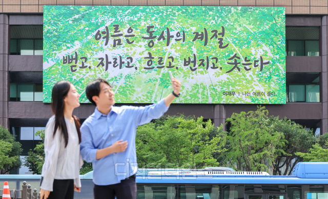 9일 서울 종로구 교보생명빌딩 외벽에 이재무 시인의 '나는 여름이 좋다'에서 발췌한 광화문글판 여름편이 걸려있다.